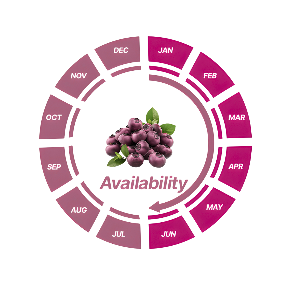 Cultivées dans des sols riches en nutriments et récoltées à parfaite maturité, nos myrtilles offrent une chair juteuse, une texture délicate et une saveur naturellement douce et intensément fruitée.